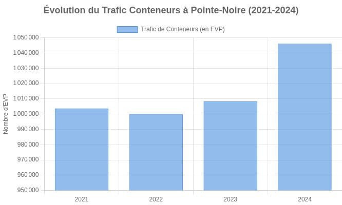 La période 2021-2024 a confirmé la dynamique de croissance du Port Autonome de Pointe-Noire (PAPN), avec une performance particulièrement forte dans le La véritable transformation réside dans l’explosion du trafic de conteneurs. Le terminal, opéré par Congo Terminal (filiale d’AGL), a franchi pour la première fois le seuil symbolique du million d’EVP (équivalent vingt pieds) en 2021, une performance historique qui s’est consolidée les années suivantes. Cette croissance remarquable — une multiplication par cinq des volumes depuis 2009 — reflète une stratégie réussie de modernisation des infrastructures et d’orientation vers le transbordement régional. Cette trajectoire ascendante positionne le PAPN comme un acteur incontournable du commerce maritime en Afrique centrale, capable de répondre aux exigences logistiques modernes tout en soutenant l’économie congolaise et régionale.